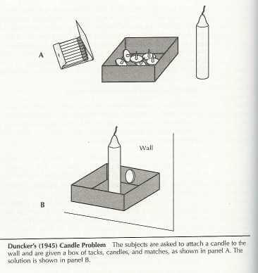1940 – 50年代に心理学者のカール・ドゥンカーが提示した「ろうそく問題」について。下図Aを参考に、テーブルの上にろうが垂れないようにろうそくを壁に付ける方法を考えてほしい、という内容だ。