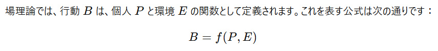 これは、行動は個人と環境の相互作用によって生まれるという考えを示しています。つまり、行動は環境の影響を無視できないということを強調しています。